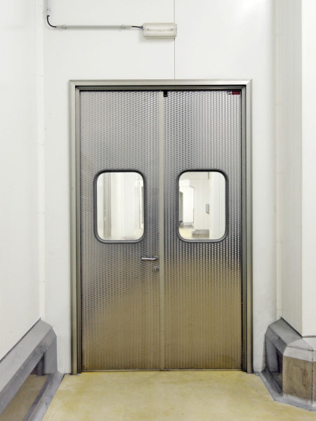 Porta industrial pivotant de serveis completament d'inoxidable amb cubeta de 40 mm de poliuretà injectat.