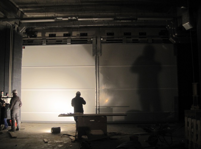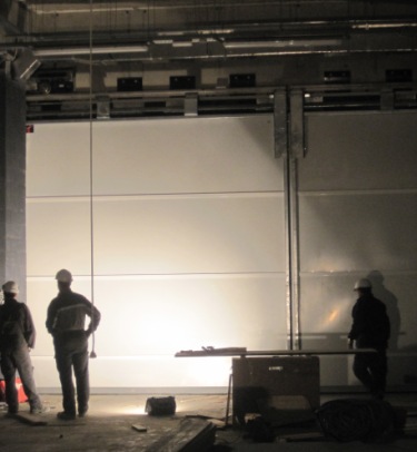 Porta corredissa acústica DAM10P Rw 44 dB de molt grans dimensions i de doble fulla. Per a la indústria, sales de motors, teatres, òperes, palaus de congressos, estudis de TV, estudis cinematogràfica, estudis de gravacions, ràdios, etc. Porta certificada: Rw 44 dB segons la norma EN ISO 140-3 / EN ISO 717-1