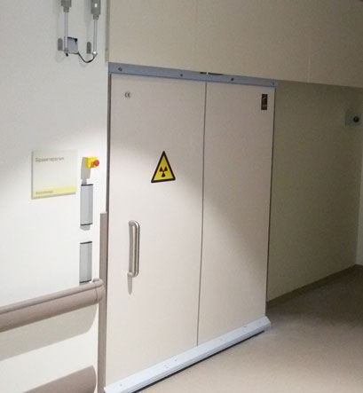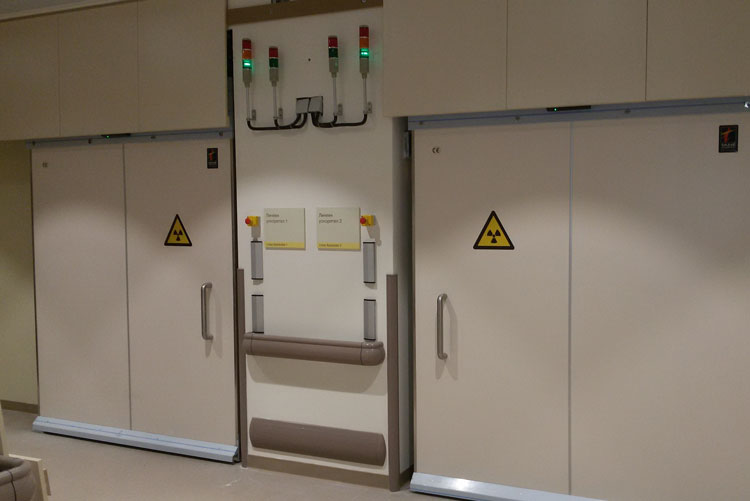 Porta corredissa emplomada STRM2 / STRM10 específica per a búnquers de radioteràpia, sales de radioprotecció medicinal i per investigació, medicina nuclear, oncologia, acceleradors lineals, escàners TEP & CT,...