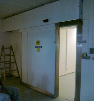 Porta corredissa blindada amb un blindatge radioprotector de plom i polietilè/parafina borada per a la neutralització de raigs gamma i neutrons.